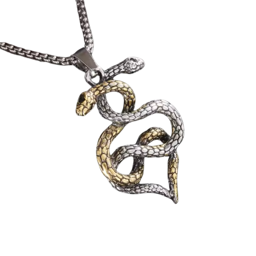 Dos serpientes se entrelazan en un equilibrio hipnótico entre lo dorado y lo plateado, representando la dualidad: luz y sombra, razón e instinto, protección y poder.