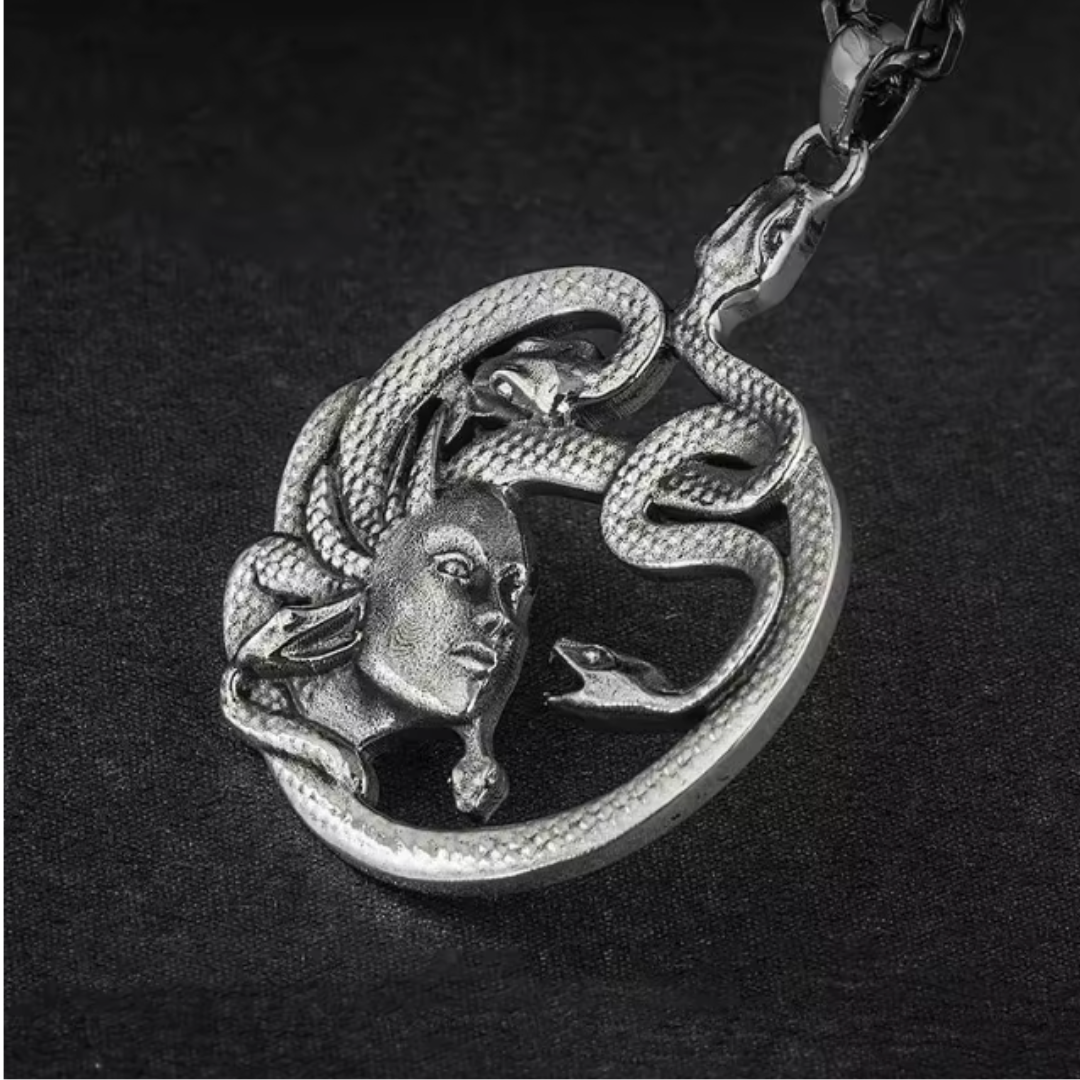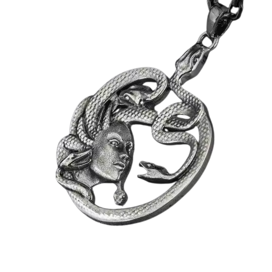 Inspirado en la leyenda de Medusa, este collar representa a la mujer que se convirtió en mito. Una figura imponente con serpientes por cabellos, mirada firme y energía que no pasa desapercibida. Ideal para quienes caminan con decisión y no bajan la mirada ante nadie.