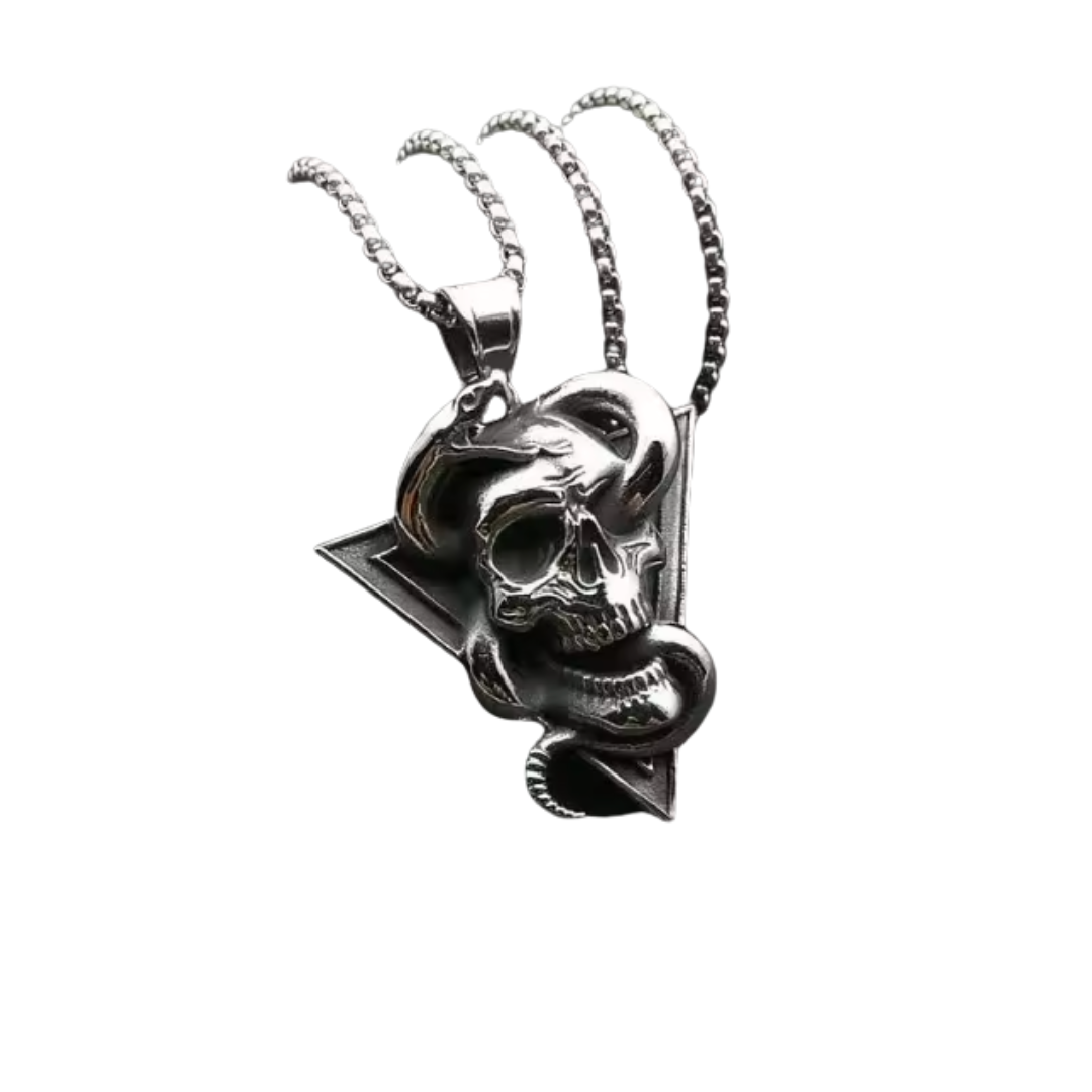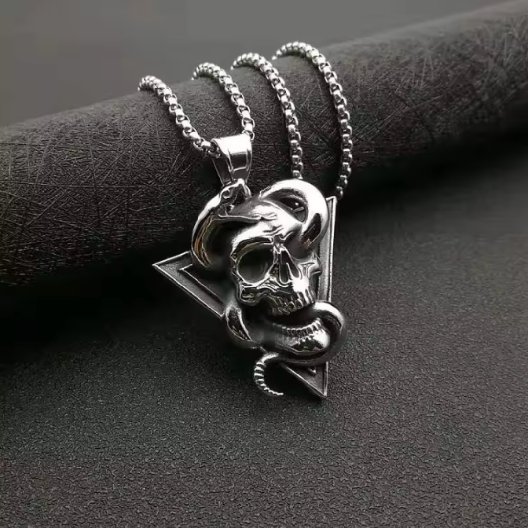 Una pieza que impone respeto y estilo en una misma jugada. Este collar combina el simbolismo del cráneo con la fuerza de la serpiente, enredada en un triángulo que evoca lo místico, lo ancestral y lo indomable. Hecho en acero inoxidable 316L, este accesorio representa poder, transformación y el dominio de uno mismo.