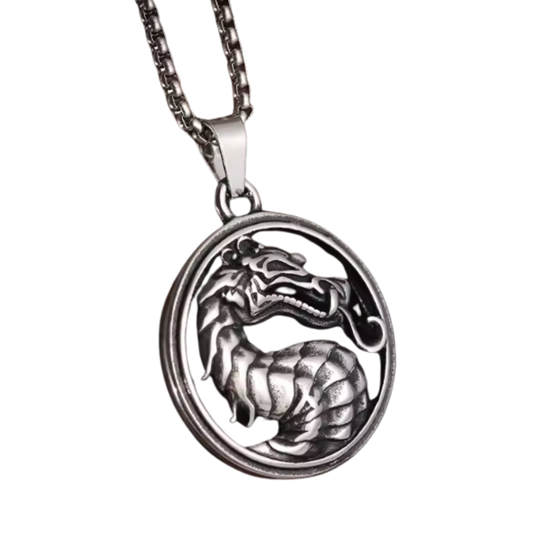 Inspirado en las leyendas orientales, este colgante representa la fuerza interior, la sabiduría milenaria y el poder de proteger lo que importa. El diseño de un dragón en relieve dentro de un círculo de acero inoxidable simboliza un ciclo sin fin de coraje y transformación.